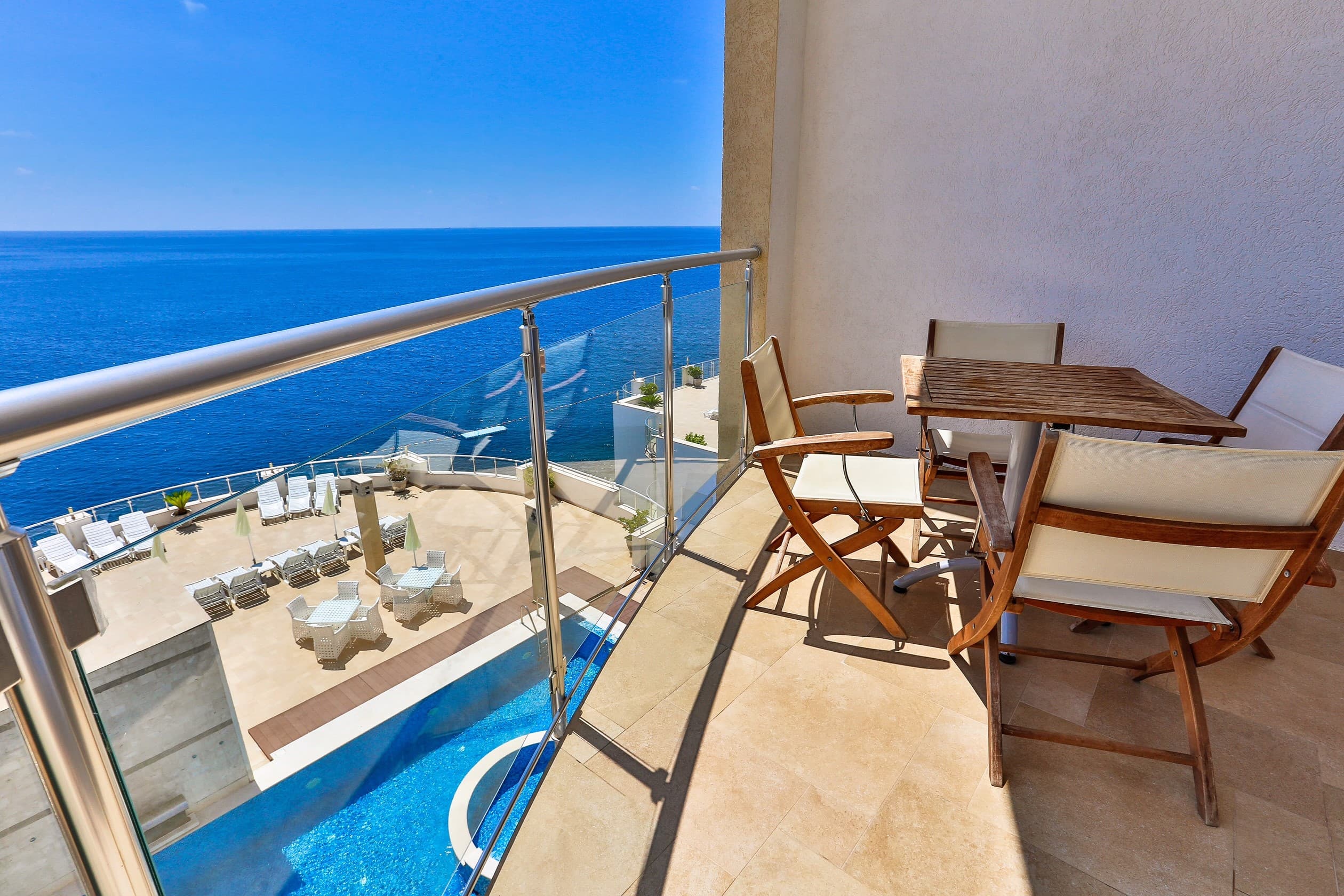 The complex, where the apartment is located, has the necessary infrastructure for living and recreation, including an outdoor pool with a private terrace with sea view, fitness center, luggage storage, sauna, parking for cars.