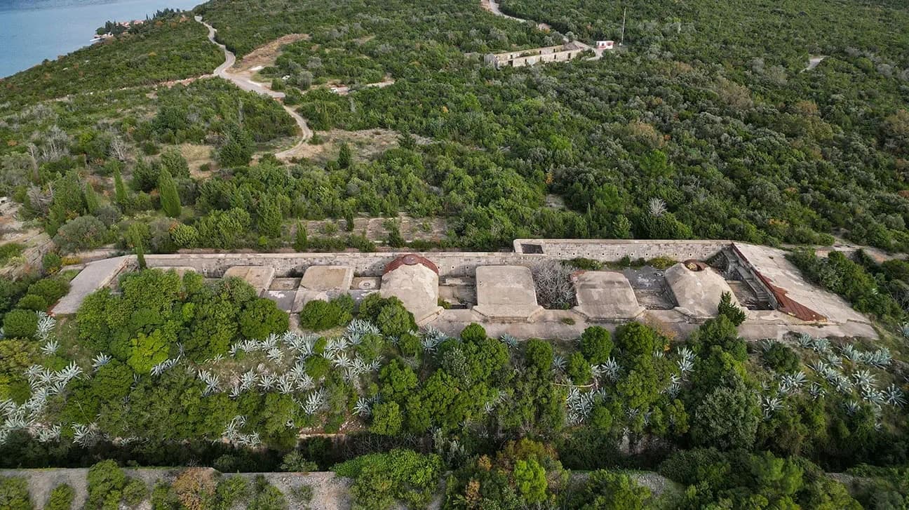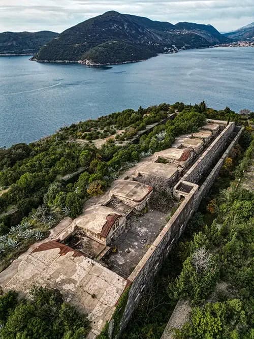 The Kabala Fortress, built between 1895 and 1897, is located on the Luštica Peninsula, overlooking the Bay of Kotor. Constructed with stone, brick, concrete, and metal, it has two levels: the lower for the garrison and the upper for defense. Surrounded by a retaining wall and moat, the fortress is currently abandoned and overgrown with vegetation, including agaves, cypress, and ivy.