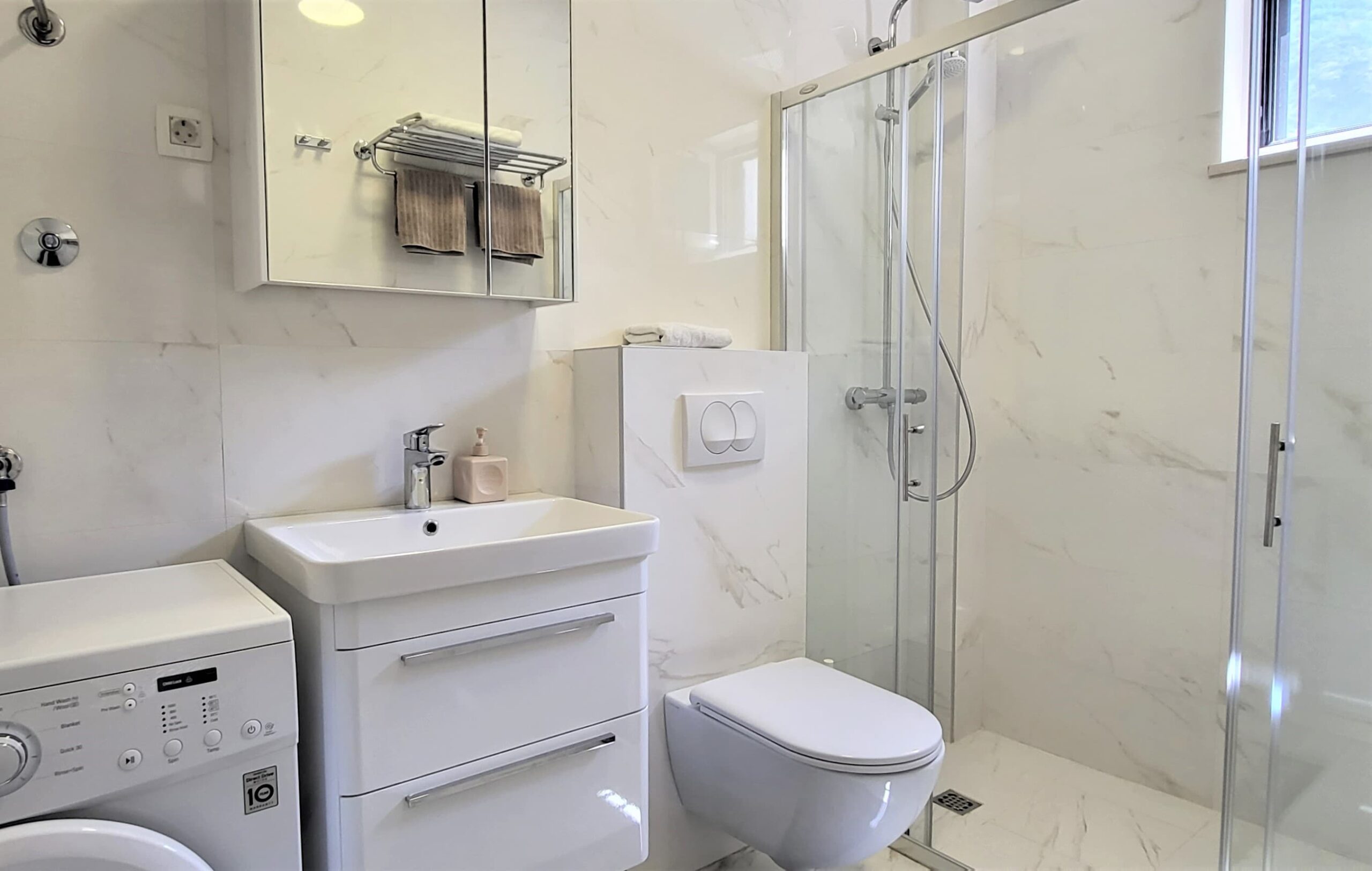 The apartment has 58m2 and consists of a living area, kitchen with dining area, both with access to the terrace, one bedroom with an en-suite bathroom, and a guest toilet.