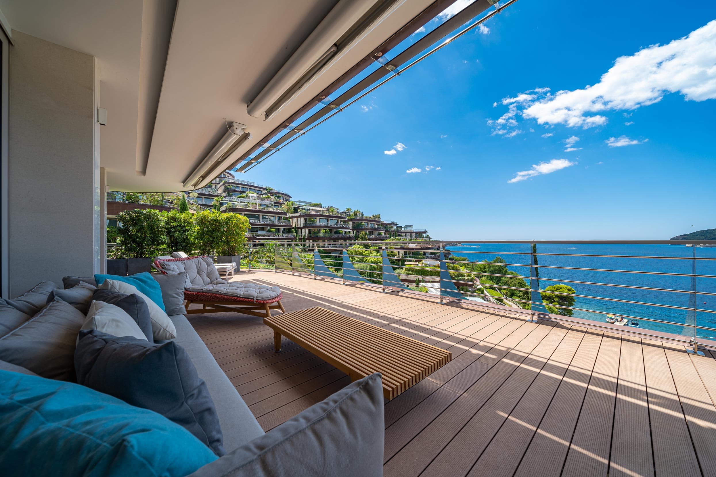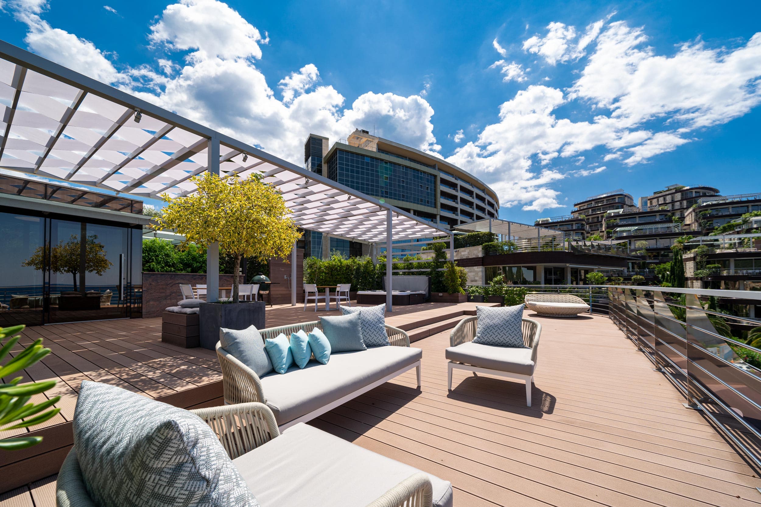 The penthouse is characterized by panoramic windows, high ceilings and spacious terraces with open sea views. The penthouse has a roof terrace with a hot tub and a relaxation area.