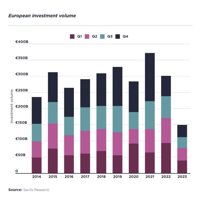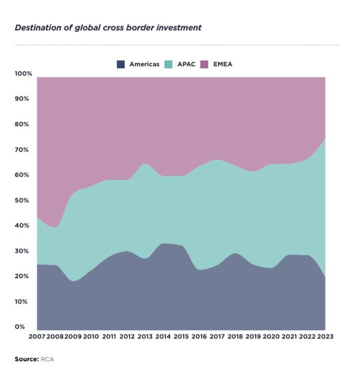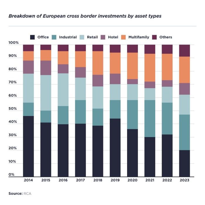 In light of repricing driven by interest rate increases, global cross border investment in real estate amounted to €196.3bn, 40% down on the five-year average, with declining inflows across all continents, according to RCA. However, EMEA was hardest hit, recording a 59% decrease on the five-year average (-56% from the American continent and -12% from Asia-Pacific). Hence, the Asia-Pacific region solidified its position as the primary destination for global cross border investments for the fourth consecutive year, highlighting its remarkable resilience. Meanwhile, Europe experienced a decline, with its share of global cross border volumes dropping to 24% last year, its nadir.