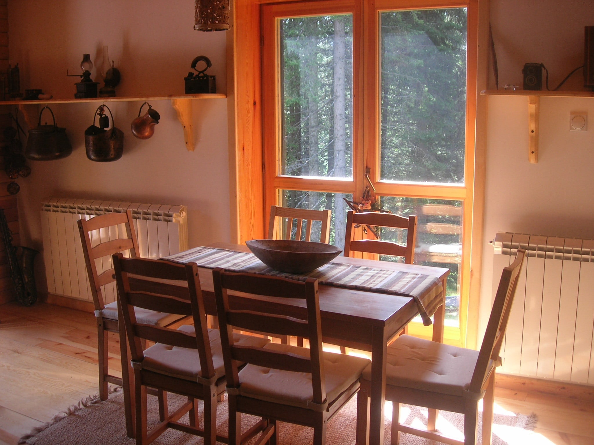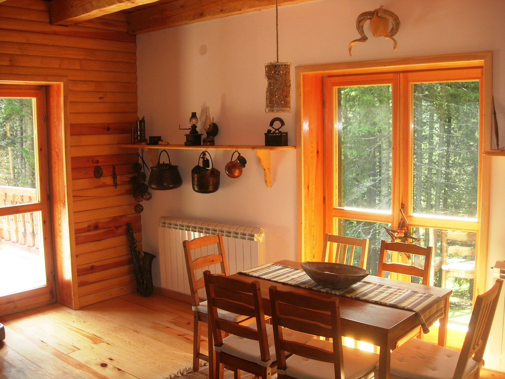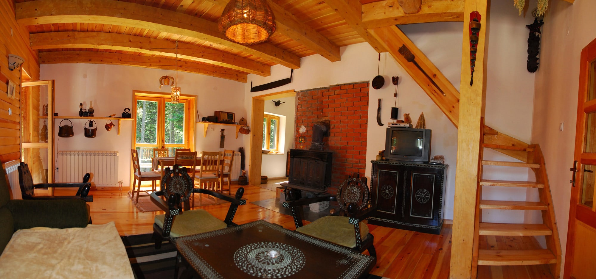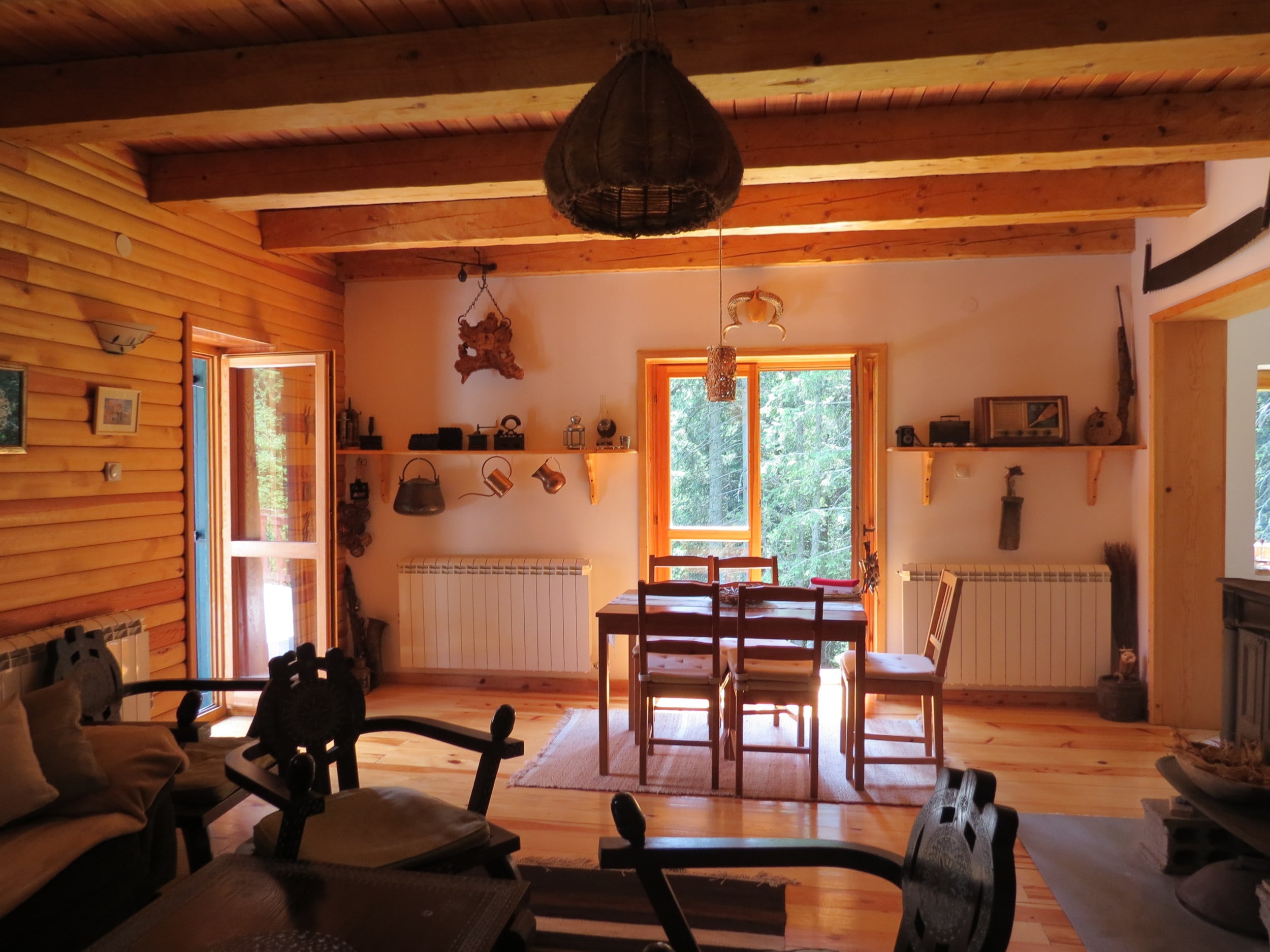 Первый этаж: просторная гостиная с дровяной печью, столовая и кухня, холл (с местом для хранения лыж и дополнительным местом для хранения инструментов, обуви и т. д.), большая душевая. Терраса около 30м2